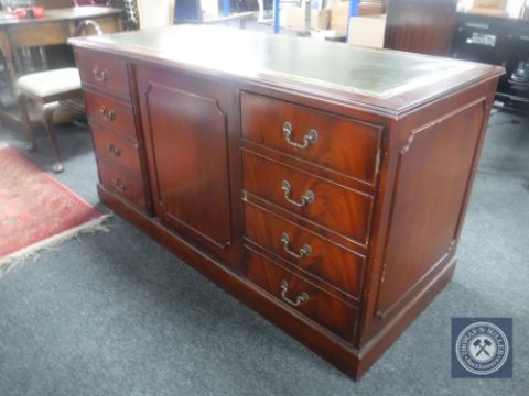 A mahogany office sideboard fitted three cupboards and inset green leather panel