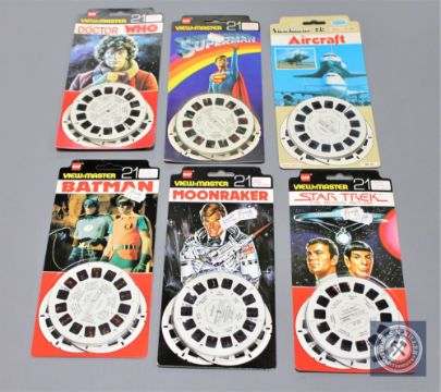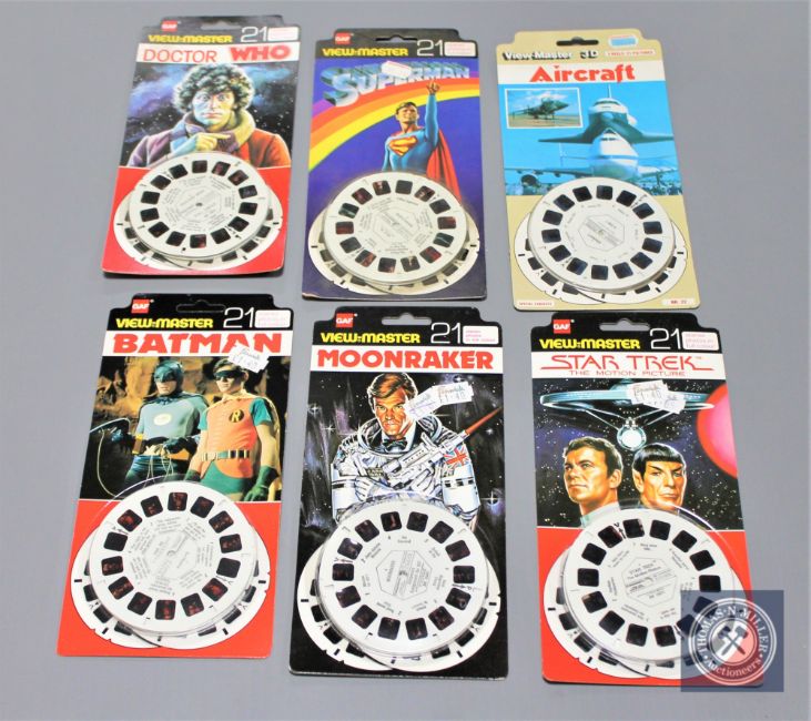 Two Chad Valley Projector Slides sets, together with a Gaf View-Master (factory sealed in card), quantity of Stereo photos in full colour to include Batman, Jet Fighters, Moonraker, Star Trek, Doctor Who, Superman, Aircraft, Terrahawks, Knight Rider, Joe 90, Mission Impossible, UFO, Thunderbirds, Tarzan (All factory sealed) and a Walton 8 Stingray 8-track, boxed.