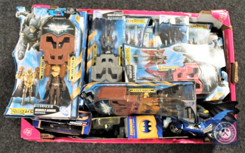 A large number of Batman action figures and accessories including die cast vehicles.