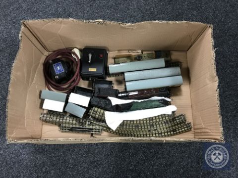 A box containing a quantity of Hornby Dublo collectables including rolling stock, coaches, track etc.