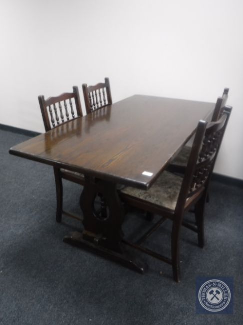 An oak refectory dining table together with a set of four oak tapestry seated dining chairs