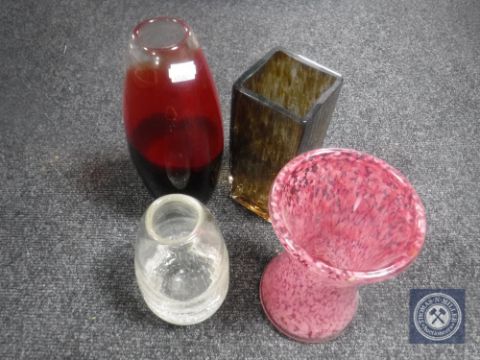 A Whitefriars crackle glass vase together with a flame red vase and two others