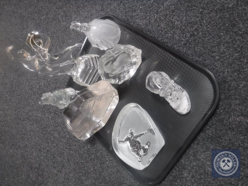 A tray of three cut glass figures together with three cut glass paperweights and a boot