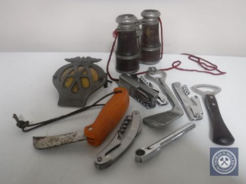 A collection of pen knives, corkscrew and bottle opener, opera glasses, AA badge etc