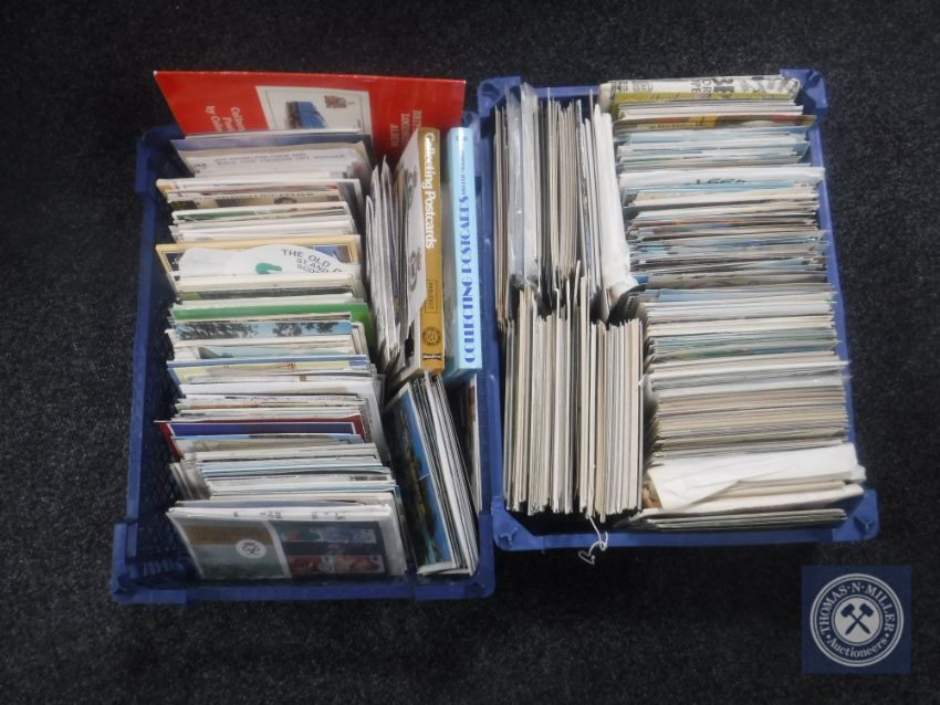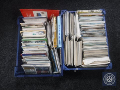 Two baskets of 20th century and later postcards, Royal Mint stamps