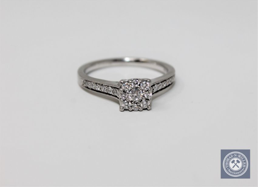A platinum and diamond cluster ring set with diamond shoulders, size K 1/2.