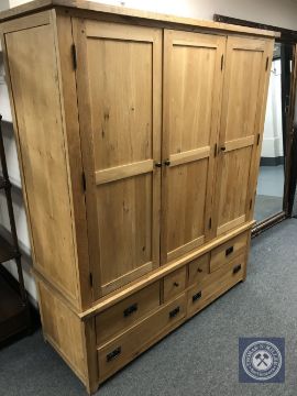 A contemporary light oak triple door wardrobe fitted with six drawers, width 161 cm