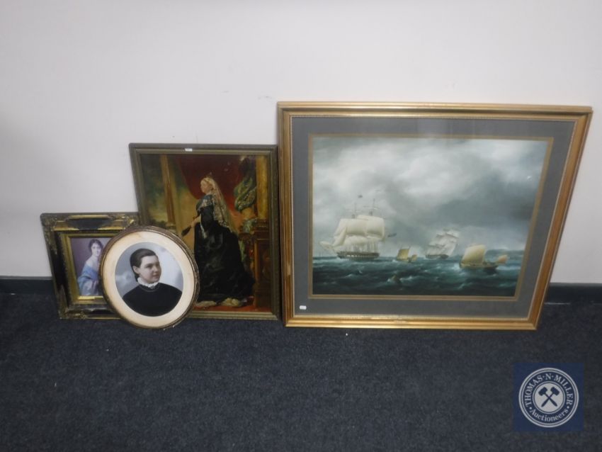 An antiquarian gilt framed oil on canvas of Queen Victoria, two framed portraits and a large gilt framed print
