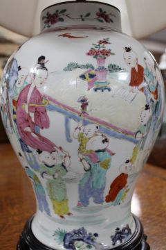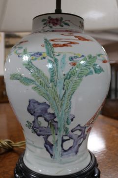 A Chinese porcelain table lamp on carved hardwood circular base