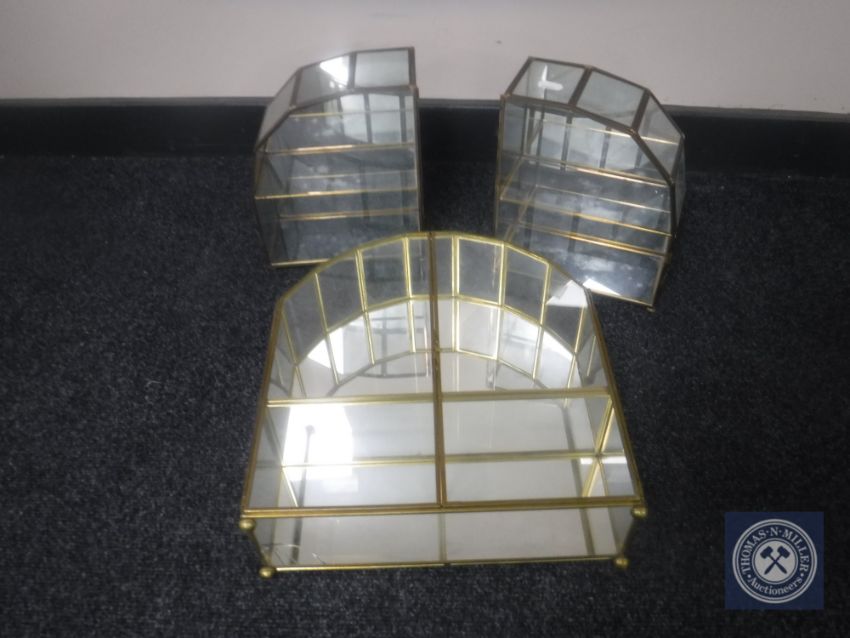 A three-piece brass and glass counter topped display cabinet on bun feet
