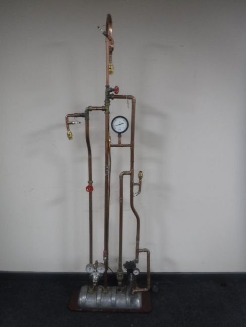 An industrial brass and copper floor lamp with various gauges