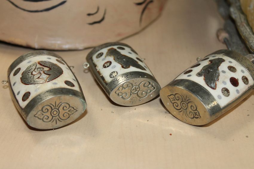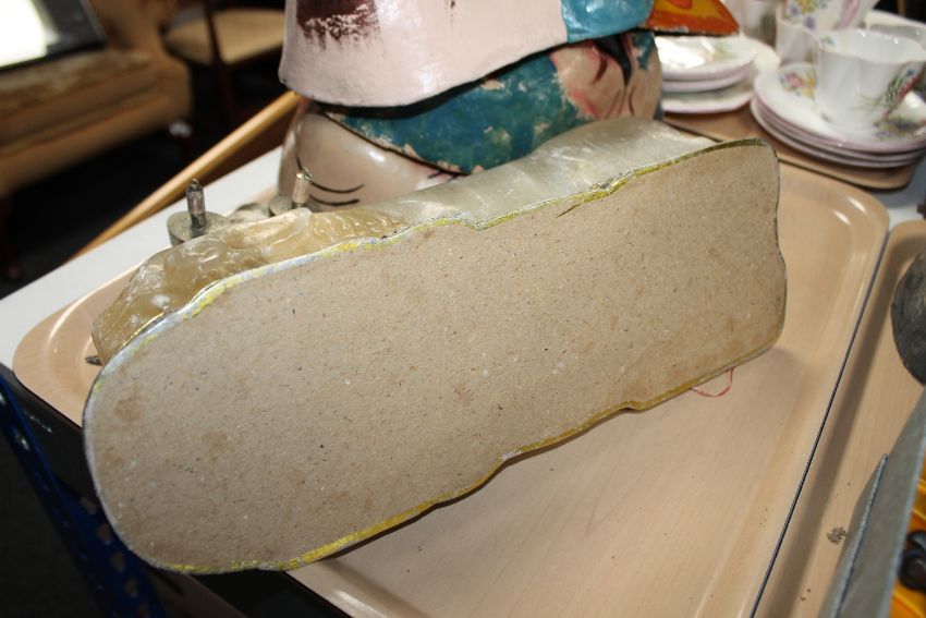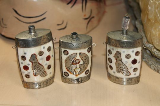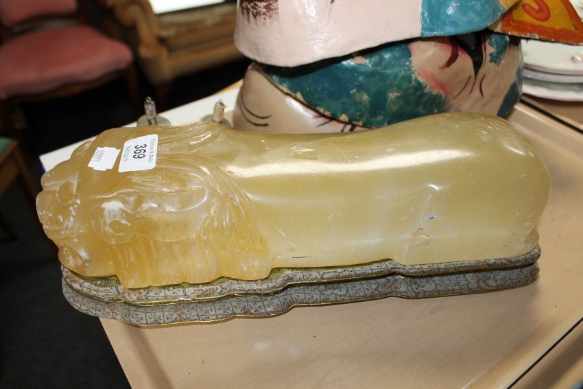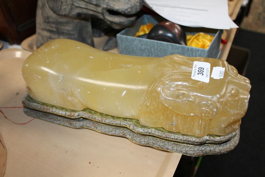 A tray of four papier mache masks, three Chinese scent bottles, onyx figure of a foo dog and an unframed oil