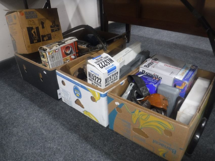 Four boxes of assorted power tools, wooden legs, washer fittings, taps, Black & Decker wall paper stripper etc