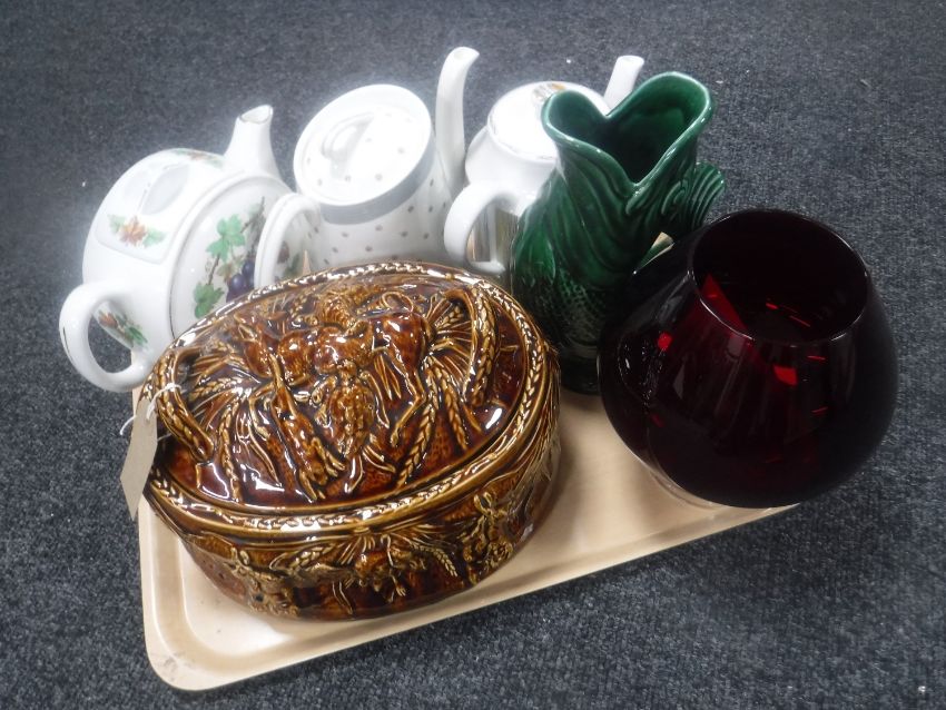 A tray of Mid Winter Sienna teapot, Ringtons teapot and one other, glazed pottery lidded game pot, Dartmouth pottery vase and a glass vase