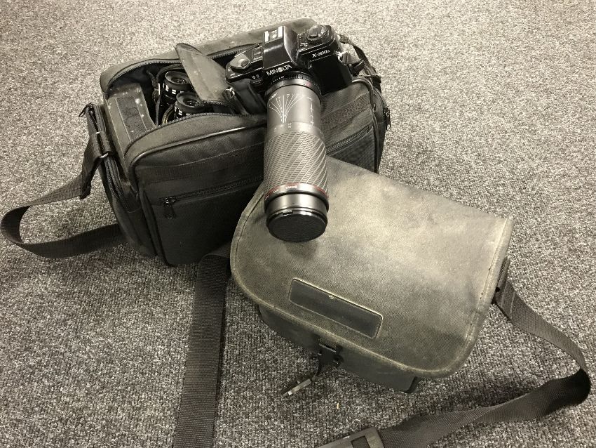 Two cameras bags containing Minolta X30 S camera with lens and accessories, Minolta 5000 camera with lens, Miranda binoculars