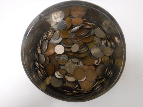 A tin containing pre-decimal copper pennies, half crowns, foreign coins etc