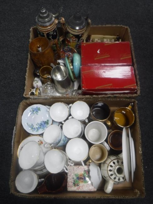 Two boxes of tea china, beer steins, glass bells, two boxed Florentine Collection figures etc