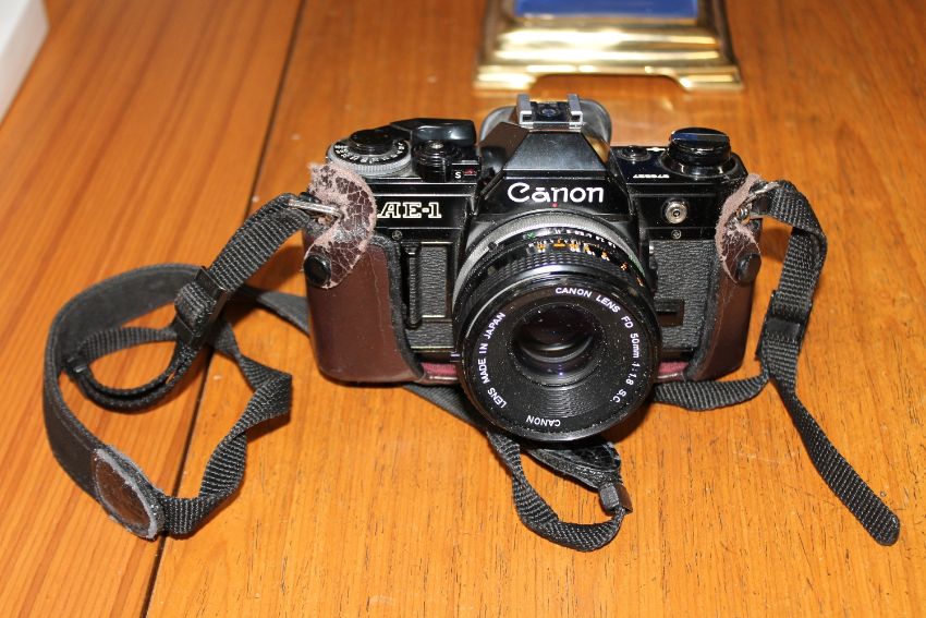 A box of assorted cameras and lenses - Minolta, Canon and Olympus