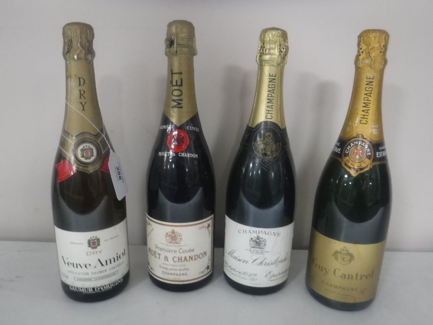 Four bottles - Maison Christophe champagne, Moet & Chandon Premiere Cuvee, Guy Cantrel champagne and Veuve Amiol champenoise. (4)