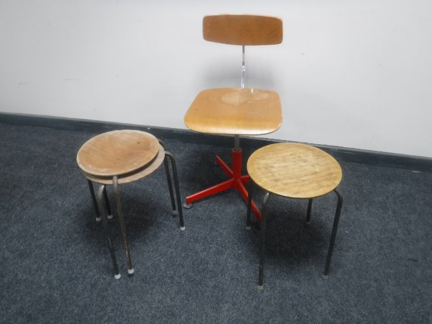 A mid 20th century teak swivel typist's chair and three metal legged stools