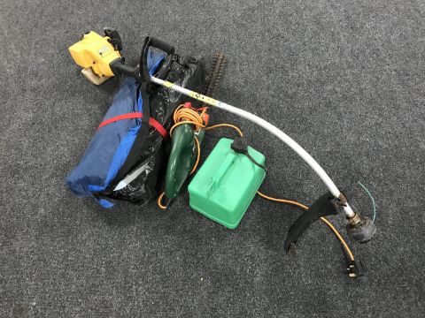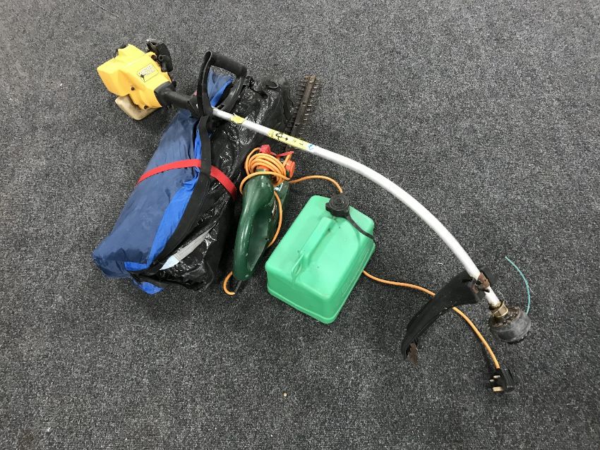 A Partner Colibri petrol strimmer, Challenge hedge trimmer, a tent and a Jerry can