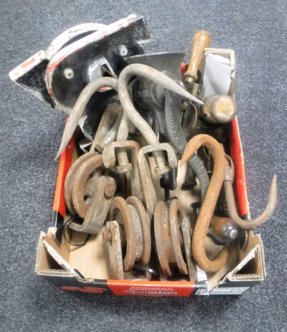 A box of two industrial letters, marmalade slicer, vintage meat mincer, S-hooks etc
