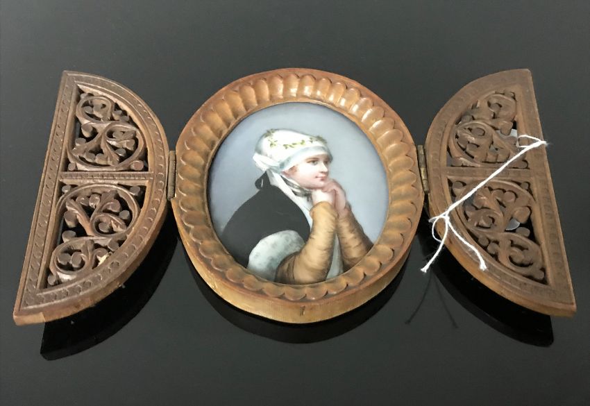 A portrait miniature of a pretty girl painted on porcelain with wooden picture frame fretwork and closing protective doors.