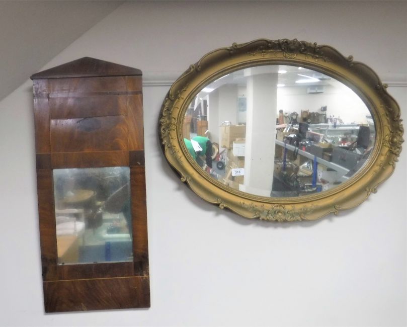 An early 20th century oval gilt framed bevelled edge mirror together with an antique mahogany hall mirror