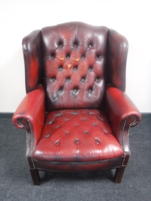A red buttoned leather Chesterfield style wingback armchair