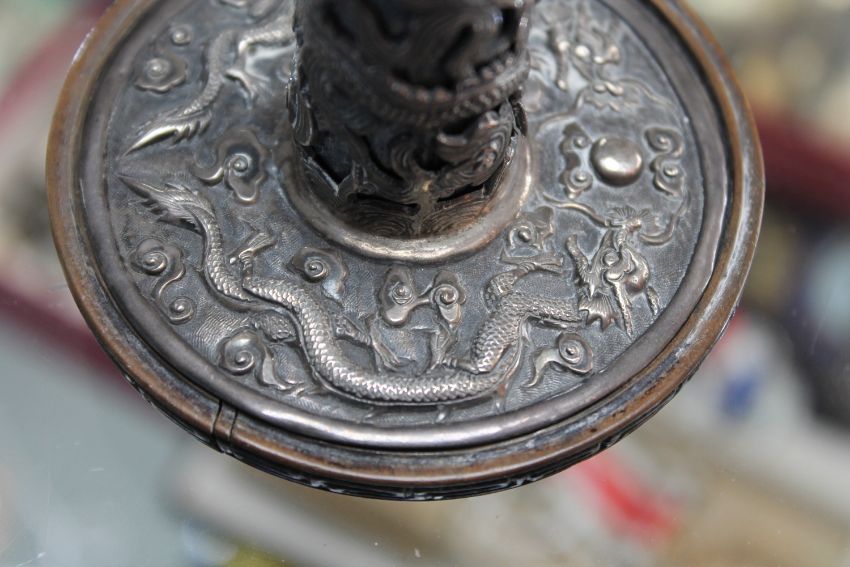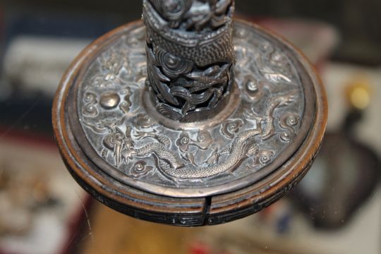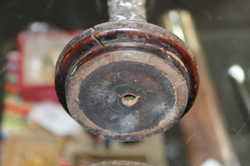 Screwed to wooden base. The candlestick itself is also weighted internally. Sconce slightly misshapen. Split to base. See additional images.