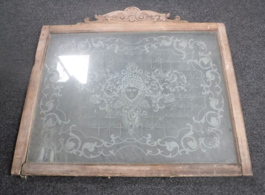 An antique etched glass window in frame