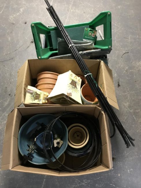 A garden stool and three boxes of garden equipment including pots, water feature, bird boxes etc