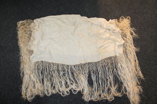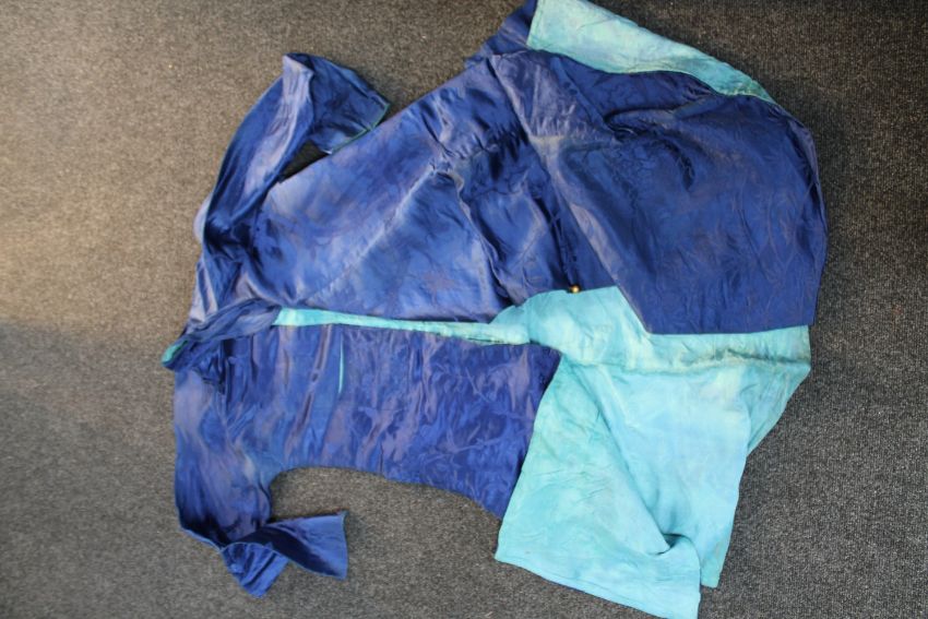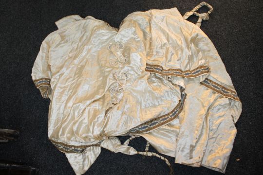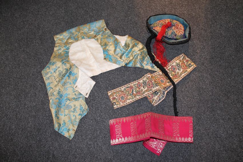 A box containing vintage clothing, ceremonial clothes, Chinese jacket and hat