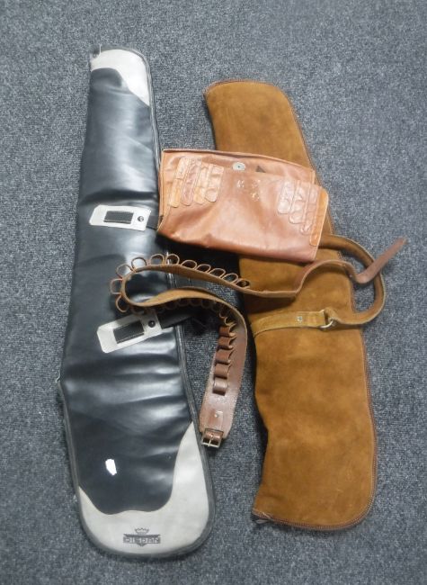 A box containing leather ammunition belt, leather pouch, two shotgun carry bags