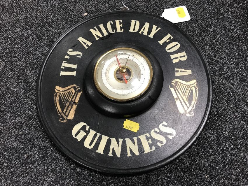 A circular Short & Mason barometer mounted on board bearing Guinness advertising