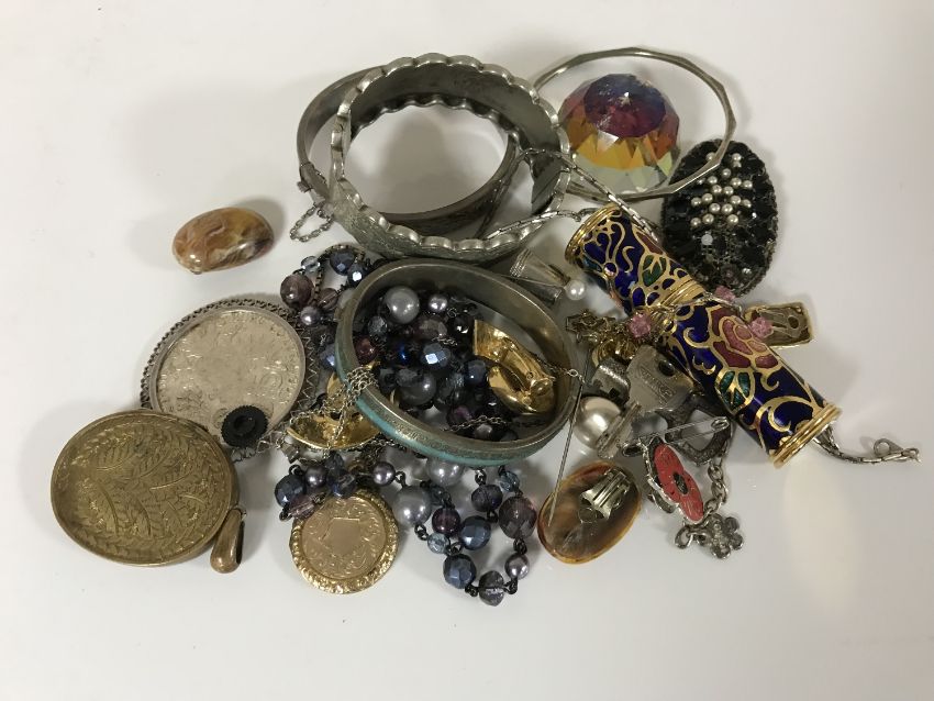 A collection of silver bangles, cuff bracelets, coin pendants, costume jewellery etc