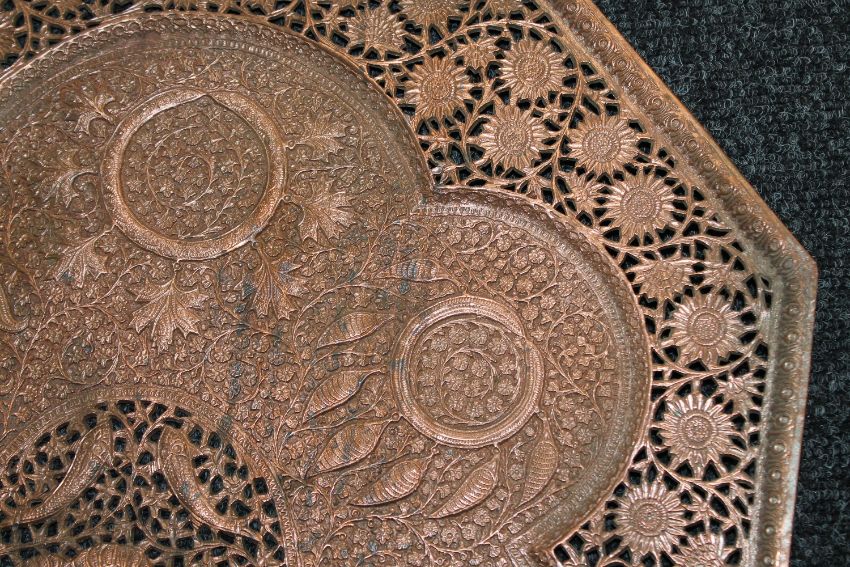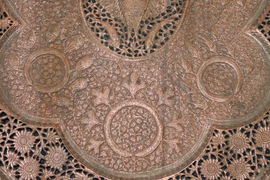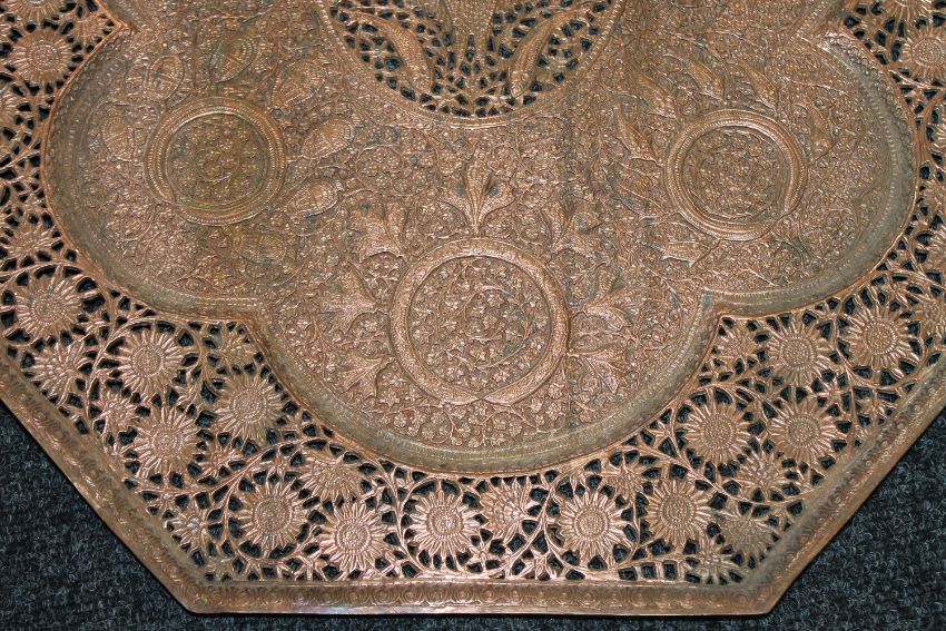 An early twentieth century Arts and Crafts panel elaborately decorated with peacock and eastern design panels, copper on tin, 42 cm 58 cm.