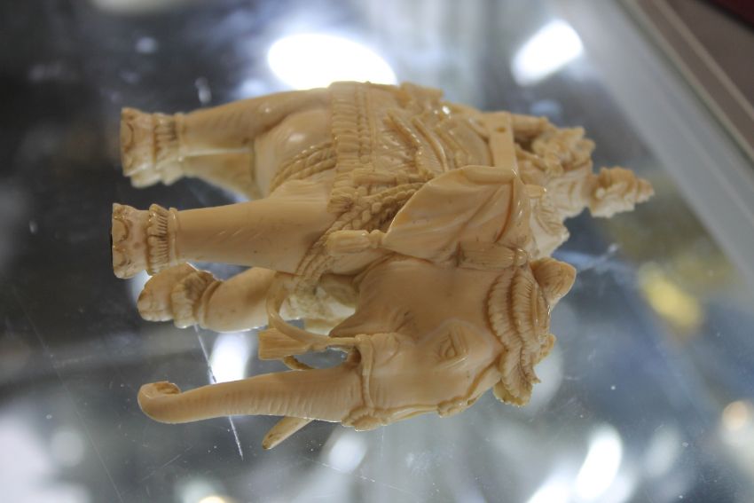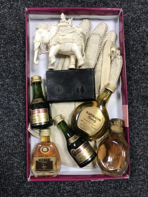 A box of vintage calf skin gloves, carved elephant figure, ivory bottle opener and five alcohol miniatures