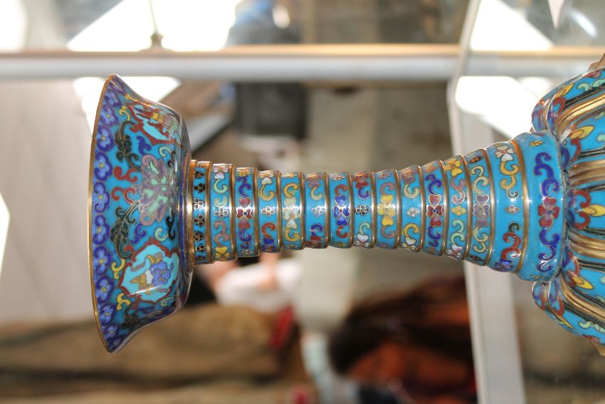 A good quality 19th century Chinese cloisonne gilt bronze candlestick, height 24.5 cm, base diameter 15 cm.