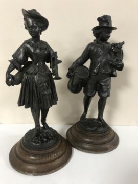 A pair of spelter figures depicting musicians on wooden plinths