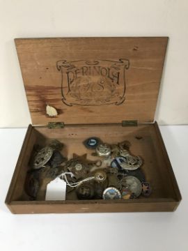 A box of military badges, enamelled buttons, Butlin's badges etc