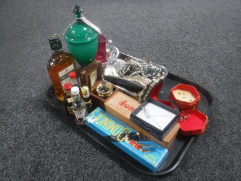 A tray of assorted costume jewellery, dominoes, boxed Captain Cook magnifier, alcohol miniatures etc
