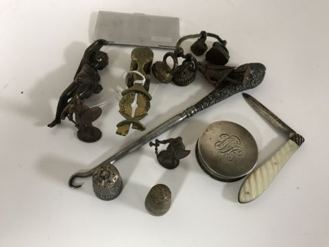 Collectables including a silver pill box, silver and mother of pearl fruit knife, sovereign scales, fob seals etc