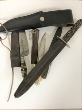 A stainless steel hunting knife in leather sheath and three further daggers