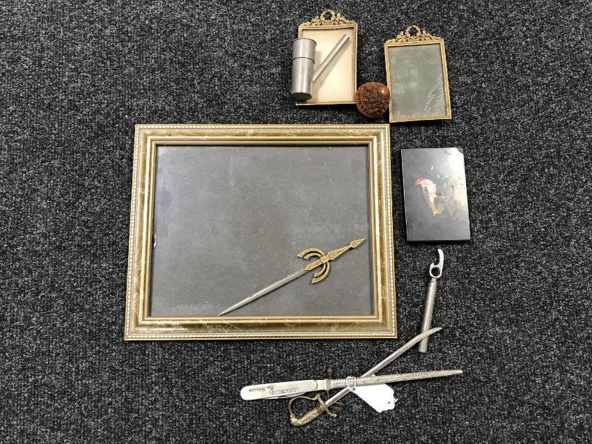 A small pietra dura plaque depicting a bird on a branch, tobacco pipe, knife, miniature photograph frames etc