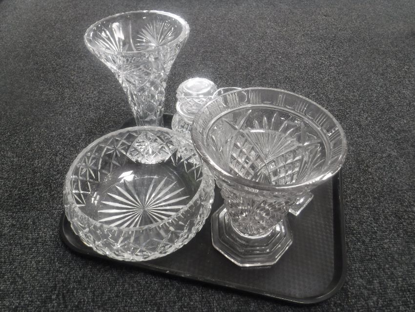 A tray of assorted antique and later glass ware including vases, bowls etc