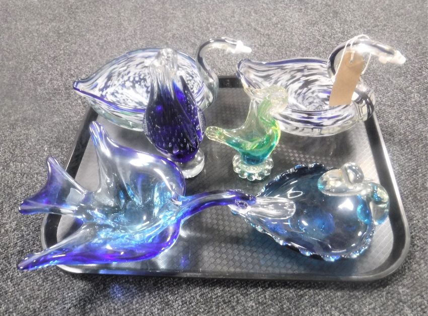 A tray of six pieces of late 20th century Venetian Murano glassware to include four bird bowls together with a figure of a cockerel and a figure of two ducks