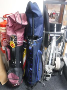 Two golf bags containing clubs, a bundle of loose clubs and two folding golf trolleys