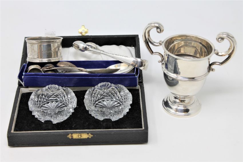 A miniature silver trophy, silver sugar tongs and other flatware, napkin ring and a cased pair of cut glass salts (Qty)