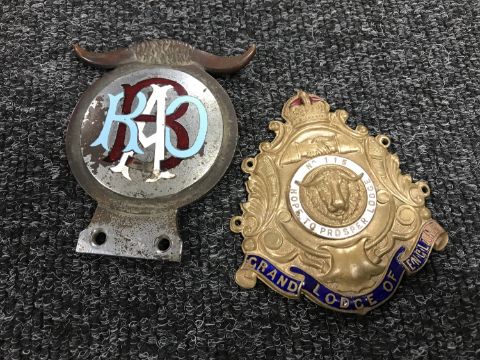An early 20th century Royal Antediluvian Order of Buffaloes enamelled car badge, together with another enamelled badge